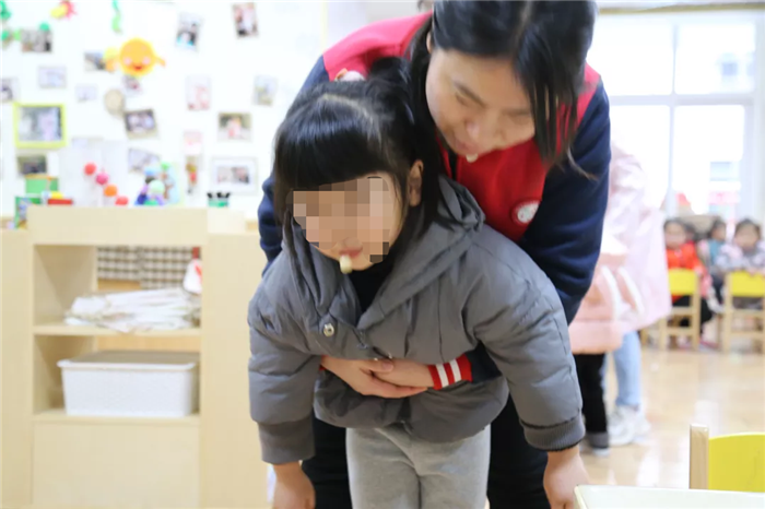 下午三点,海姆立克急救演练开始,小班一名幼儿突然被食物噎住,主班老师立即呼叫幼儿查看其意识状态,观察是否有异物梗阻情况并及时进行“海姆立克急救”,副班教师则电话上报保健室并安抚其他幼儿情绪。与此同时,保健室接到报告后立即向分管领导汇报,并迅速到班级进行紧急处理。整个过程有条不紊,充分彰显了古运实幼教职工在面对突发情况下的沉着与冷静。