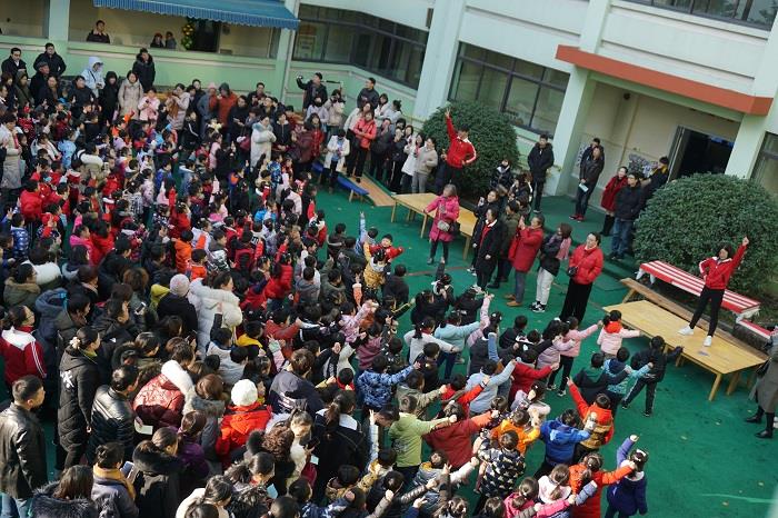 八点五十五分,一群朝气蓬勃,青春活力的老师们带来的热身舞把孩子们和家长们的兴奋元素激发出来了。操场上,近千人共同舞动着、跳跃着,热热闹闹迎接2020的到来。