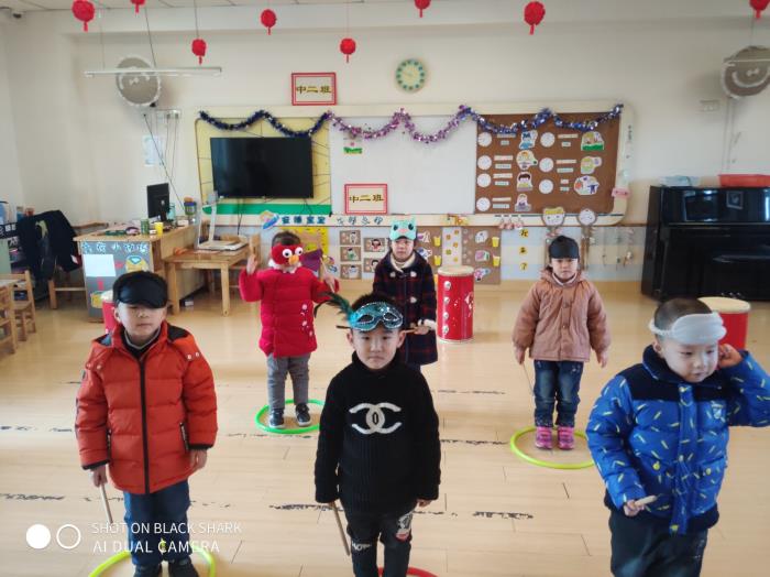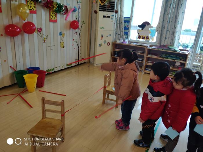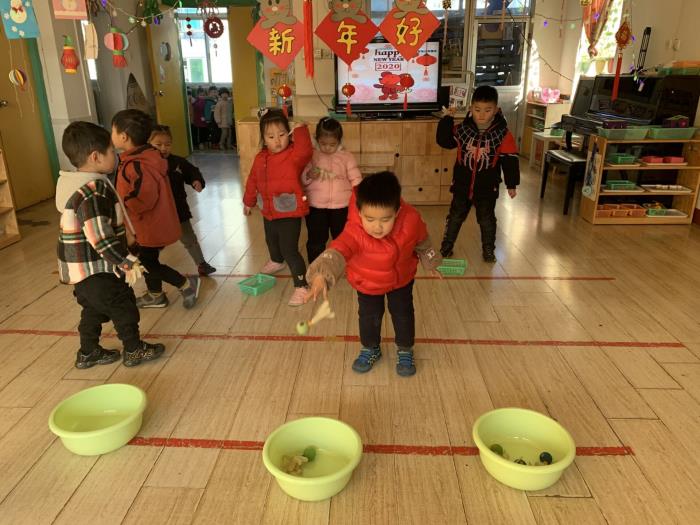 游园会游戏活动中,小班的孩子玩了纸筒运托盘,跳圈敲鼓,捞鱼,盲人敲鼓等。其中,他们对盲人敲鼓有着浓厚的兴趣,他们蒙上眼罩,拿上小木棍,寻找着小鼓,敲响的那一刻,成功的喜悦油然而生;玩过一个班级后,他们会选择其他班级,继续进行游戏。中班与大班的孩子们,也在寻找着自己的快乐,投壶,趣玩弹弓,总能看见他们大展身手。辞旧迎新,欢乐不断,游戏之余,孩子们品尝自己游戏赢来的小礼品,体会成功的快乐。