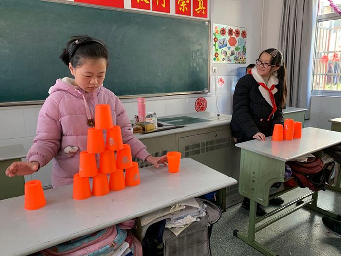 纸牌搭高塔,动手又动脑。音乐教室内,“纸牌搭高塔”比赛正在紧张地进行着。五年级每班派出10名选手参加挑战赛。瞧,他们两两组队,有的趴在地上,有的歪着头看着,有的双手叠着纸牌,从地面开始搭建扑克牌。选手们以折、叠、弯、插等形式对纸牌进行改造,搭建出高度不一、稳定性强的高塔。究竟哪队技高一筹?还要各凭本事。