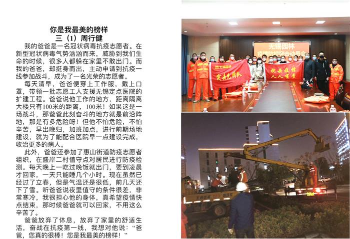 有的队员从自己父母身上感受到了榜样的力量,以文章的形式记下了他们的感受。李启平的妈妈是人民医院的护士,看到妈妈不顾休息全力战斗在岗位上,他乖巧地安排好自己的生活,不让妈妈操心;周行健的爸爸是一名抗疫志愿者,支援无锡定点医院的扩建工程,参加新村防疫检测,周行健既心疼爸爸,又感到自豪、骄傲;董一璐的爸爸负责公司工会工作,为了企业的发展,确保防疫、生产两不误,早出晚归,全然不顾自己的休息……这些队员都说父母就是自己最美的榜样。