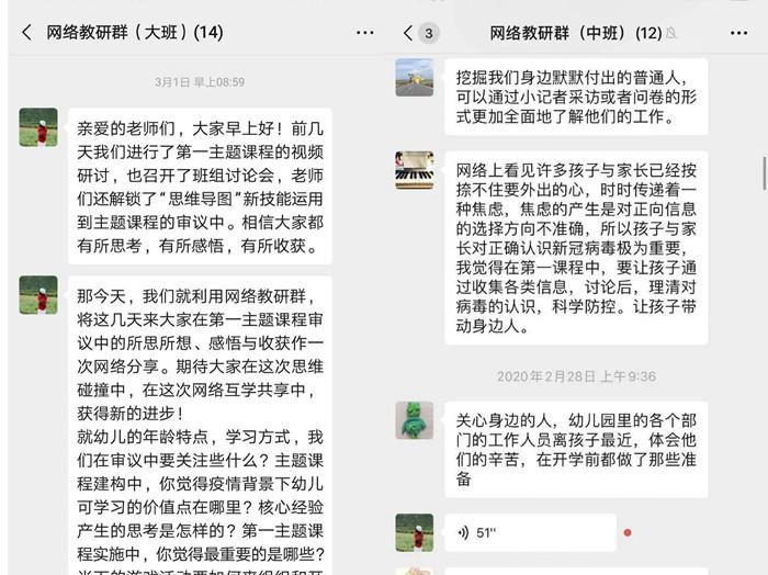 孩子们的生活,就是孩子们可学习的课程。针对新冠病毒的疫情,结合当前的实际情况,根据不同年龄段幼儿的学习与发展特点,全体教师通过语音、视频等形式进行线上教研活动。教师们在线上积极交流,通过思维碰撞产生智慧的火花。选择一个适合班级幼儿的“小”点切入,用“一张图”“一条路”的形式呈现级第一主题网络图、主题脉络图、班级课程资源地图,为课程实施打下坚实的基础。