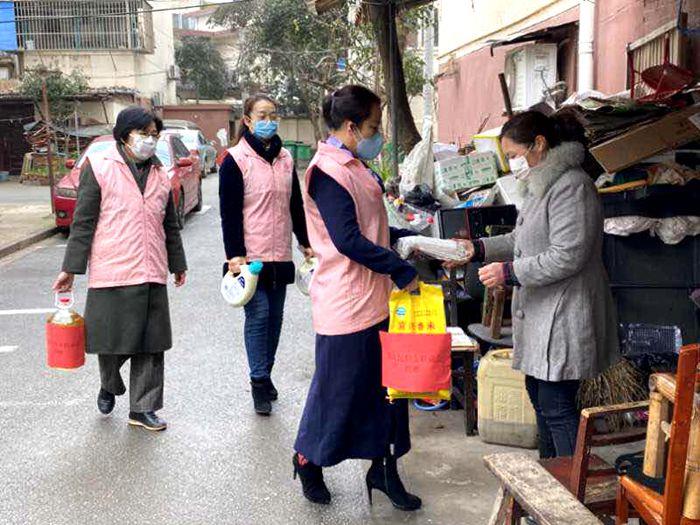 王阿姨是一名下岗职工,独自带着孩子一起生活,平时靠摆地摊支撑生活,星星托幼中心的潘荷娟园长握着王阿姨的手,说道:“今天是‘三八’妇女节,祝你节日快乐。这是我们的一点心意。”说着,递上了一桶油、一桶消毒液和防疫宣传手册,王阿姨很是感激,连连道谢。