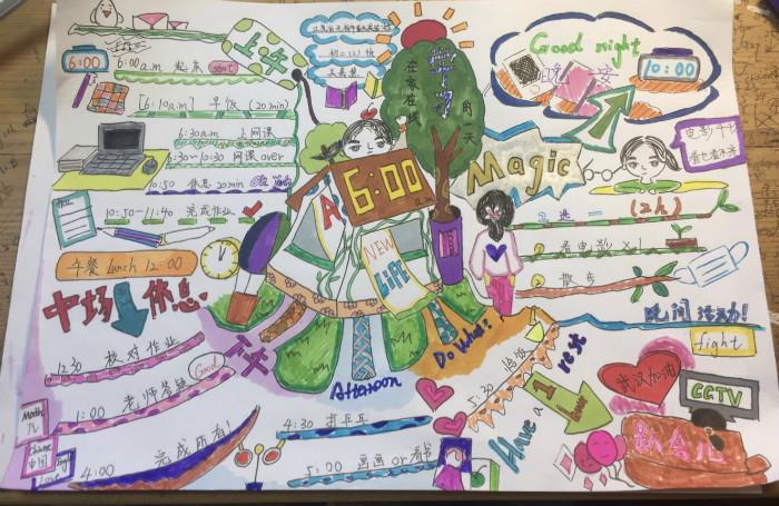不少孩子不约而同地选择了时间轴的形式,显得条理清晰;也有画成饼状图的,每日时间分配一目了然;还有做成手账的,有趣的贴纸和彩笔互相映衬;更有画成漫画的,细细诉说“在线”的青春;甚至有画成思维导图的,丰富的宅家活动难掩一丝霸气。通过制定时间表,孩子们提高了自主学习、自主生活的能力。