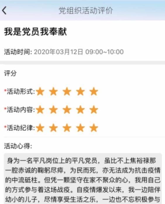 通过此次党课,激发了党员们的担当意识,奉献精神,一场突如其来的新型冠状病毒让全体党员进入抗疫状态,只有冲锋在前,无私奉献才能更好地诠释一名优秀党员的光辉形象。