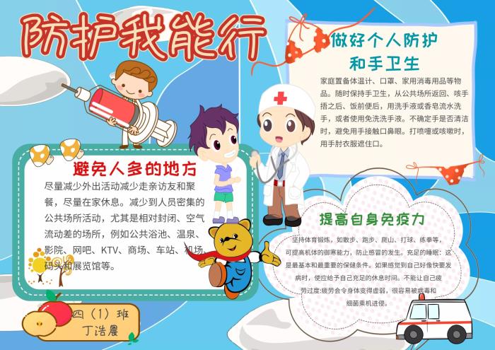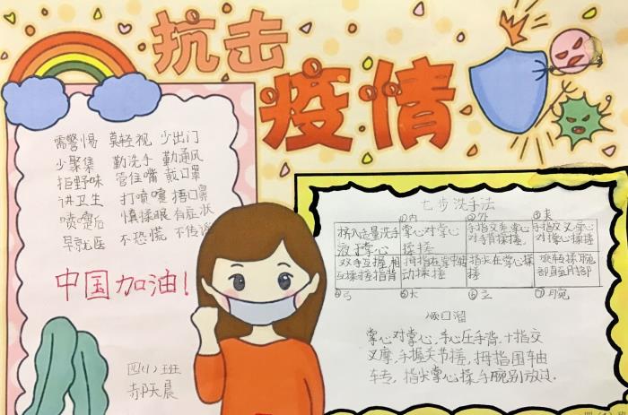 “工欲善其事,必先利其器。”疫情防控不能打无准备之仗。同学们为做好个人防护纷纷献计献策,制作了电子小报和手抄报进行宣传。有的同学通过发言向大家介绍了自己的防疫“金点子”和小妙招;有的同学说起了“个人防护拍手歌”,朗朗上口,简单易记;还有的同学展示了自己在居家生活中怎样进行个人防护,生动形象。2月份,王贻暄妈妈进入负压病房工作,这个病房是专门收治新冠肺炎的病区,她也给我们带来了许多关于个人防护的专业建议。虞雯祺同学制作了一个PPT,为同学们介绍了校内该如何做好防护。