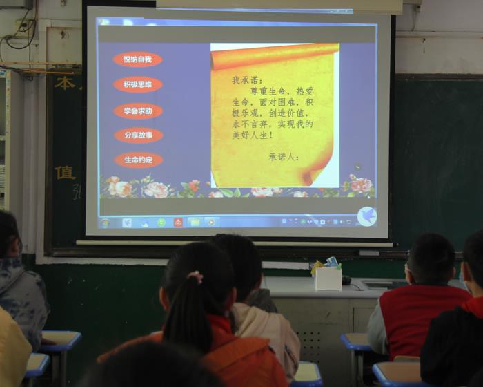 “生命是顽强的,因其顽强,我们就应该敬畏生命,战胜挫折;生命也是脆弱的,因其脆弱,我们就应该呵护生命,保护自我;生命是宝贵的,我们就应该珍惜生命,珍爱时光。” 沈老师那抑扬顿挫的语气,深入浅出的讲解,让人无比回味:我们小学生一定要上好生命教育第一课:认识生命,欣赏生命的丰富和可贵;用心经营生命,思考生命的方向。最后沈老师号召全体学生要善于悦纳自我,要积极思维,要学会求助,要分享生命故事,要承诺生命约定。同学们听后自发站起,举起右拳,用真诚的心情大声诵读:“尊重生命,热爱生命,面对困难,积极乐观……”