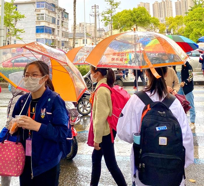 无锡市梨庄实验小学领导班子立即应对,一方面按防疫期间的放学工作流程,一个班一个班错时放学不放松;另一方面,为了让孩子们不淋雨不着凉,让很多步行的孩子能安全到家,班子成员们站在校门口,一把一把为没带伞的孩子送上了“诚信伞”。