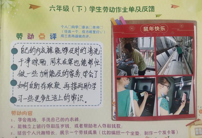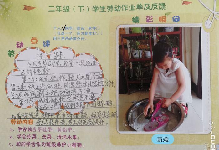 “以家庭为基地,让劳动成为日常生活”这是山北中心小学教师和家长达成的教育共识。每逢节假日,山小学子们都会根据《劳动作业单》,完成一项特殊的课外作业。这份《劳动作业单》里的每一项劳动任务,都是依照孩子身心特点和成长规律来设置,图文并茂地记录下学生们自我服务、家政服务和志愿服务三个方面的精彩瞬间和来自家长、孩子们的劳动点评。