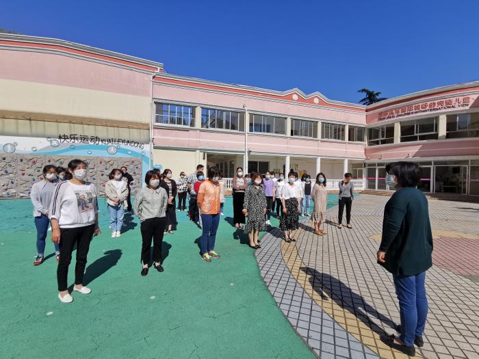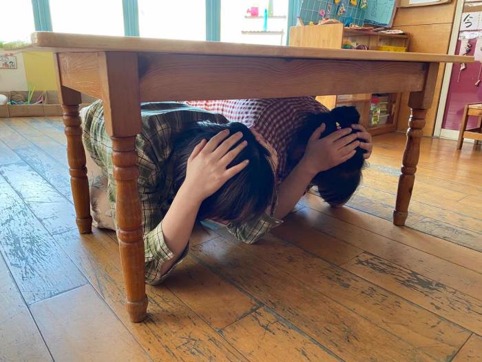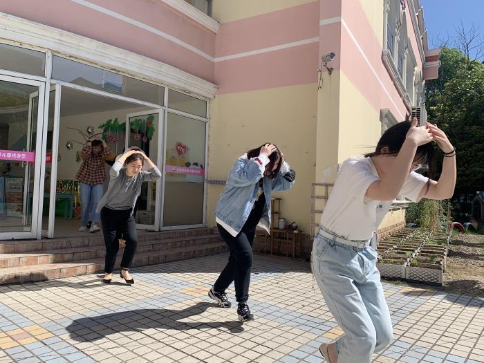 地震警报拉响,老师们引导幼儿(教师扮演)迅速做好避震准备,双手抱头,快速有序的按照指定疏散路线从活动室撤离到幼儿园空旷地带。部分幼儿(教师扮演)则在墙角、钢琴、桌子底下等就近相对安全的地方抱头蹲下。随后,各班老师清点人数并上报。活动结束后,许老师进行了总结,肯定了这次疏散活动的迅速性有序性,重点提出:回班后,教师应及时引导幼儿分批洗手、喝水、测量体温,并时刻关注幼儿身体状况。