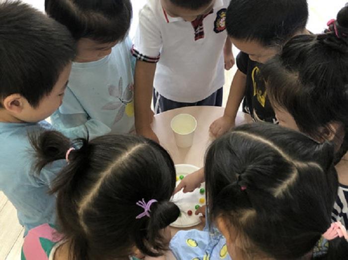 活动中,孩子们首先进行了色彩大调查,在集体面前积极表达自己喜欢的颜色。接着,孩子们在美丽的商业幼儿园里寻找和分享自己找到的各种各样的色彩小精灵。孩子们在美工区和颜色做游戏,进行了喷画、滚珠画、点画、拓印、刮画等活动,每一种颜色,都代表了孩子们不一样的心情。一幅幅五彩斑斓的作品,印拓出孩子们对这个世界的热爱。有的孩子在涂色的过程中发现,不同的颜色抱在一起会变魔术!真的会变成新颜色吗?为了验证孩子们提出的困惑,开始了科学探索、证实。进行了颜料混色、黏土混色、彩虹糖大变身、颜色爬升等实验。