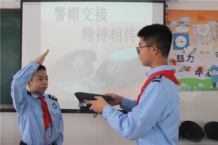 四年级的萌警们排着整齐的队伍,昂首挺胸,六年级的萌警,手捧警帽,小心翼翼地为学弟学妹们戴上。他们一边为学弟学妹们整理碎发、调整帽檐,一边送出自己的期待,希望学弟学妹们继承发扬学警精神,不畏艰难,顽强拼搏,创造美好的未来。小小萌警们郑重向学长学姐敬礼,除了表达感激之情外,也树立了决心——在未来的日子里要重视学习,成为他人好榜样!