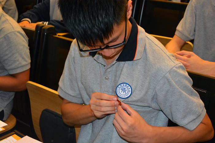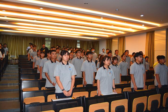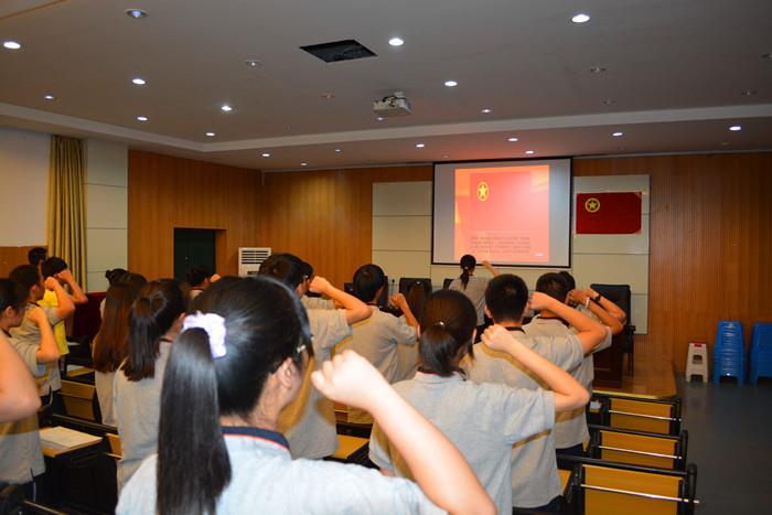 入团仪式在庄严肃穆的国歌声中开始。于书记宣读了新团员名单,2018级1班团支部书记吕德鑫宣读了《团章》中有关团员义务和权利的条款,2018级各团支部书记为新团员佩戴团徽,新团员们在团支书吴诗怡的带领下面对团旗郑重宣誓。