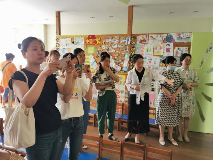 观摩活动结束,姐妹园教师开展了交流研讨活动,太湖实幼的教师作了特色主题墙的缘起、过程及收获,并针对姊妹园教师在环境创设中产生的困惑进行了解答和互动。在研讨中,老师们知道应注重幼儿自己动手创作,亲身体验,拓展和激发幼儿的学习兴趣,引发幼儿自我学习的好奇心和主动探究的求知欲。“让幼儿真正成为环境的主人,促进幼儿主动发展的需要”。