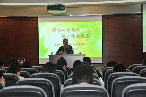 朱书记指出,高素质的教师队伍是一个学校的未来,师德师风是教师队伍建设的基本内涵,关乎个人成长,关乎学生教育,更关乎学校发展。师德师风建设要切实强化“四个意识”(政治意识、大局意识、核心意识、看齐意识),不断提高执教理念、信念和境界。朱书记结合对“四个意识”的认识和理解,对“四个意识”进行了深入细致的解读。他的讲解铿锵有力,谈吐不失风趣。朱书记在讲到政治上成熟的老师一定是稳重的、渊博的、敏锐的时候,在场的每位老师都进行了深深的自我解读和思考。在讲到强化核心意识方面,朱书记强调教师要发挥自身的核心作用,做到以下四点:一、岗位是体验自身工作能力、价值的平台;二、岗位是做好事、做善事的平台;三、岗位是一个交好朋友的平台;四、岗位是不断丰富知识、积累经验、成长自己的平台。朱书记希望,广大教师要坚定理想信念,树立崇高的教师职业理想,以师德楷模、育人模范、教学专家为目标,强化“四个意识”,不断反思、修正、提高自己,做到“知行合一”。
