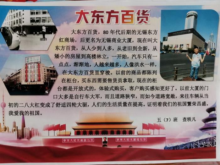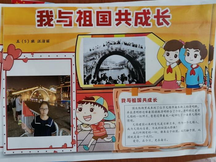 国庆假期期间,一、二、三年级的同学们围绕“我和祖国同欢乐”这一主题,唱一首爱国歌曲,诵一首爱国诗歌,为祖国妈妈送上生日祝福,和祖国妈妈同欢乐。四、五、六年级的队员们围绕“我和祖国共成长”这一主题,变身小小摄影师,把家乡的新面貌拍下来,一路寻找幸福,一路感悟家乡巨大的变化。