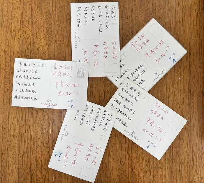 广丰中学的铿锵玫瑰在赛场上驰骋风云,中考战场上也定不甘落后。家长们尽管不能陪伴左右,但在女足班主任朱静丹老师的提议下,他们精心录制了视频给孩子们加油鼓劲。朱老师也为女足姑娘们准备了一份惊喜——文具和“照片糖”。