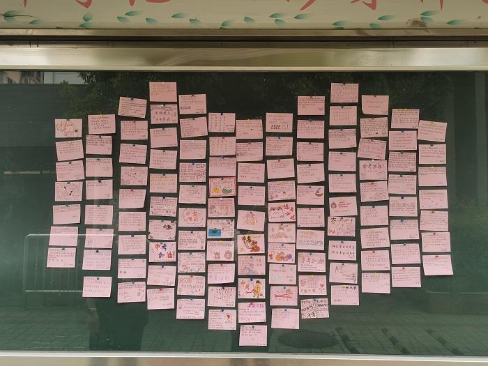 班会课上,学生们观看了心理老师沈瑜为大家录制的视频,学会了一些调整心理状态,增强心理能量的小妙招。班级教室黑板上高高挂起的粽子,包裹着老师满满的爱意和由衷的祝福,每一个便签上都写满了学生最美的期待。班主任老师给每名学生定制了一瓶可乐,上面都刻有他们的名字和祝福语,学生们纷纷上前留影,必胜的信心都要溢出屏幕了!每位任课老师也给初三学子送上了中考祝福,李蓉老师的“加油明信片”带给学生们勇气和信心,刘正锋老师的卡通点心带给学生温暖和力量。