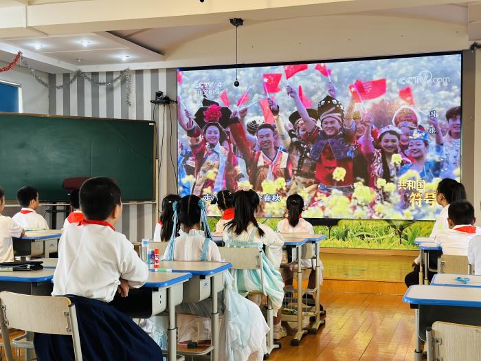 红石榴少年们一起观看了央视纪录片《共和国符号》之国旗。“去北京天安门广场观礼庄严的升旗仪式,是每个中国人的梦想。每天都有成千上万人会聚于此,专为注目五星红旗迎风招展而来。一年365次日出,五星红旗伴随太阳冉冉升起,在雄浑的《义勇军进行曲》中映红黎明,那是最让人心潮澎湃的共和国符号。”队员们专注地观看,对五星红旗的设计有了深刻的了解:五星红旗的设计有非常鲜明的象征性,红色是体现生命和力量的色彩。而黄色,我们是黄皮肤的民族,是黄河的象征,黄土地的象征。1949年10月1日开国大典上,伴随着震天动地的礼炮声和雄浑的《义勇军进行曲》,毛泽东主席按下了升旗开关,亲手升起了天安门广场上新中国第一面五星红旗。在亿万人民的仰望和欢呼声中,五星红旗向全世界庄严地宣告:中华人民共和国成立了,中华民族从此将屹立于世界东方。