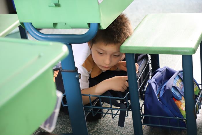 演练活动于大课间正式启动,全校师生积极响应参与。首次警报响起后,师生迅速在课桌下采取避险姿势,利用硬质物体保护头部,模拟地震发生时的即时应对。紧随其后的第二声警报标志着疏散程序开始,班主任老师带领学生,手持书本等作为简易遮挡物,沿既定疏散路线快速、有序地撤离至学校大操场,整个过程紧张而不失条理。