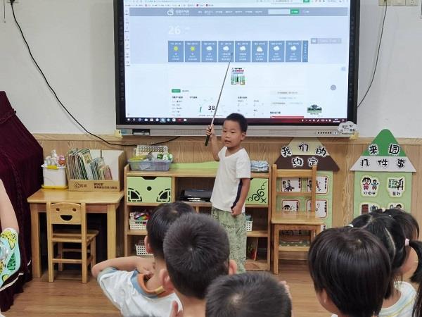 每天晨间的“天气播报员”活动,更是中班的“热门项目”。宝贝们拿着话筒自信地播报当天天气, 播报条理清晰、发音标准,有的结尾还不忘加一句 “祝大家在幼儿园玩得开心”,可爱的模样逗得小伙伴们哈哈大笑。