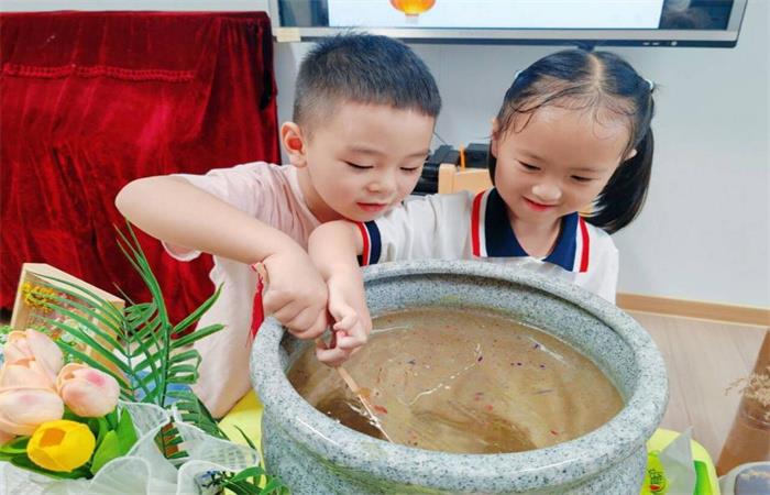 中班年级组的活动围绕中秋节来开展,处处洋溢着传统佳节的浓郁氛围。孩子们在老师的指导下,巧手制作了象征吉祥与团圆的中秋兔子灯,一盏盏充满童趣的灯笼点亮了他们对传统节日的理解。此外,制作“漆扇”这一新颖活动尤为引人注目,孩子们将颜料滴入水中,通过巧妙的拨动和水拓技术,制作出独一无二、色彩斑斓的漆扇,亲身体验了非遗技艺的奇妙。经典神话情景游戏“后羿射日”更是将活动推向高潮,孩子们在角色扮演中,深刻感受到了远古英雄的勇敢与担当。