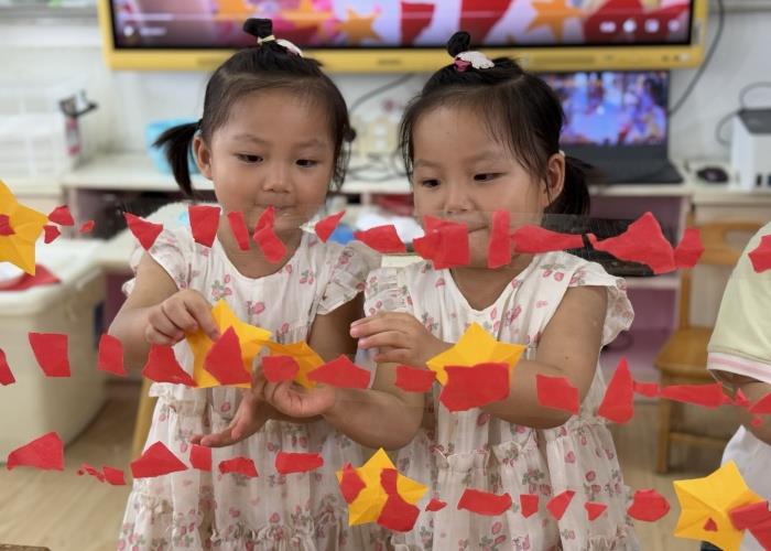 刚入园的小班幼儿虽稚气未脱,却用纯粹的行动表达对祖国的喜爱。伴随着《我是中国娃》的欢快旋律,孩子们扬起稚嫩脸庞,眼神里满是自豪与喜悦,爱国的种子在歌声中悄然扎根。在“撕一撕、贴一贴”的趣味操作中,孩子们亲手解锁国旗的专属色“中国红”——鲜艳的红色卡纸在小手中变成一个个“迷你国旗”,每一抹红都承载着孩子们对祖国最纯真的祝福,也让“家国”的初印象在心中慢慢清晰。