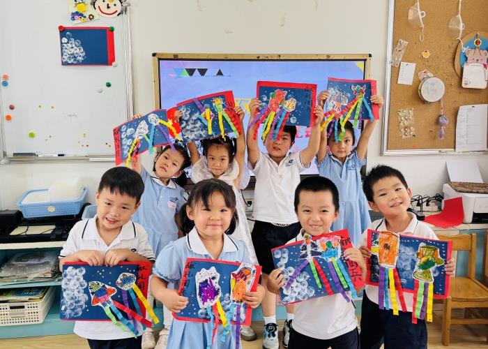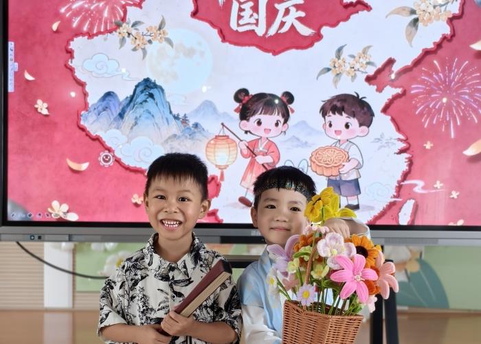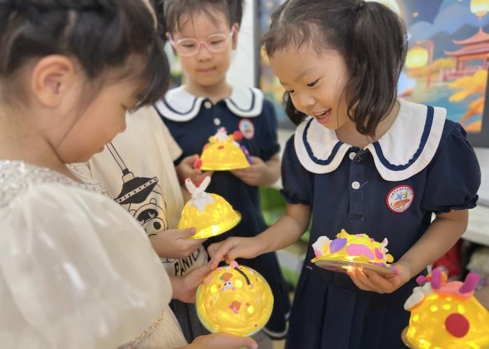 中秋元素的融入更添仪式感。孩子们用剪、贴、绕、画的方式制作月球兔子灯,当灯光点亮,柔和的光芒映着笑脸,也点亮了传统节日的魅力;随后,孩子们换上汉服、唐装与旗袍,伴着悠扬的古典音乐,手持玉兔灯、荷花灯缓缓走秀,一颦一笑皆有国风韵味,举手投足尽显文化自信,让中秋的诗意与国庆的庄重在此刻完美融合。