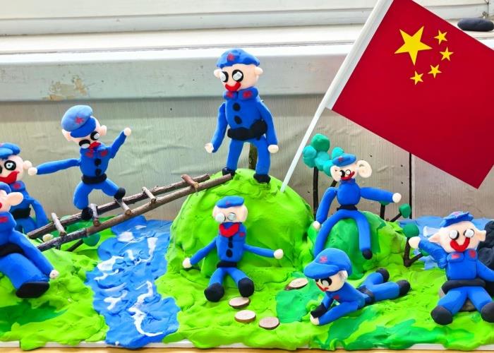 中班幼儿化身“小小创作家”,以手作传情、以故事润心,让爱国情怀看得见、摸得着。在红色绘本课堂上,老师带领孩子们走进《小红军的故事》,红军爷爷不畏艰难、勇敢战斗的情节,让孩子们听得聚精会神;随后,孩子们用黏土捏制“小红军”形象,圆圆的脑袋、挺直的腰板,虽造型稚嫩,却复刻出战士们的坚毅模样,完成了一场“童趣与红色精神的对话”。