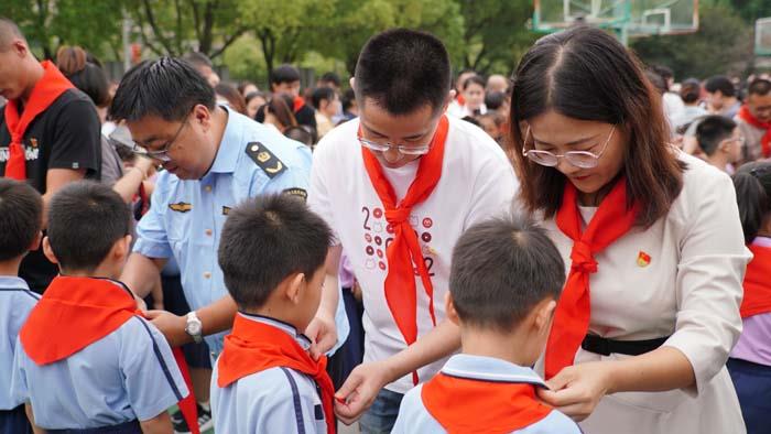 德育处金皑老师郑重宣读新队员名单,一张张稚嫩的脸庞写满了期待与自豪。在动人的乐曲声中,党员家长、中队辅导员与老队员一同为新队员佩戴上鲜艳的红领巾。一条条红领巾,不仅系在胸前,更系住了传承的使命与时代的嘱托。