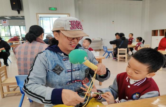 活动以童声献唱开启,小班宝贝为爷爷奶奶们演唱《快乐的小宝贝》《爷爷亲奶奶亲》等儿歌,稚嫩的歌声与可爱的动作温暖全场,爷爷奶奶们的脸上满是幸福;随后的互动游戏环节,一下子让现场氛围热闹起来。“泡泡糖”游戏中,宝贝与爷爷奶奶按指令 “粘” 在一起,相拥大笑、默契牵手,笑声不断;“重返童年——钓钓乐”游戏里,宝贝专注垂钓,爷爷奶奶一旁指导,重温童年乐趣。制作艾草如意锤时,宝贝们在爷爷奶奶的帮助下将小木棒插入艾草包,用彩绳一圈圈缠绕在木棒上,每一个动作都饱含着对爷爷奶奶的爱意。