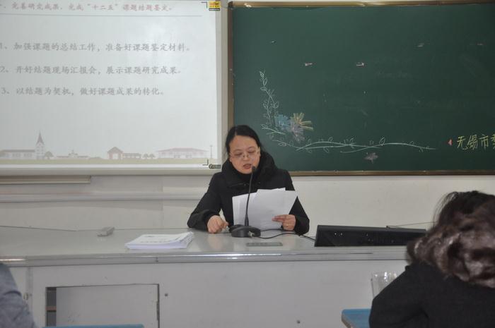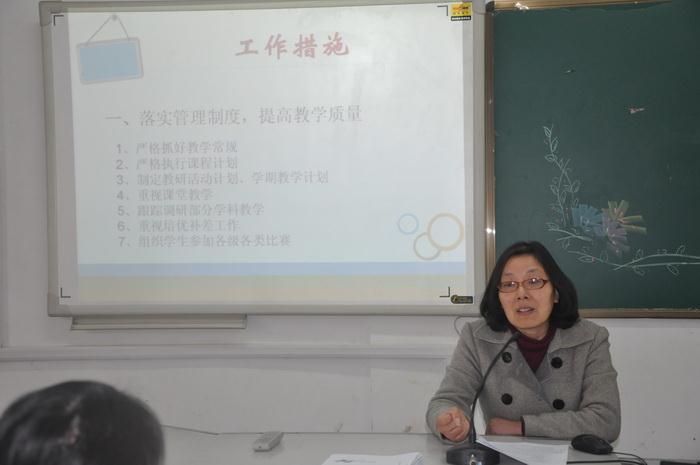 学校教导主任高菊英老师以“常规管理工作更精细”、“校本教研更有效”、“教学质量更稳定”、“师生素质更全面”为本学期教学工作主要目标,从 “管理制度的落实促进教学质量的提高”、“课程改革的强化促进校本研修的有效”以及“校园生活的丰富提升学生综合素养的形成”三方面向老师们详细解读了本学期的教学工作计划。